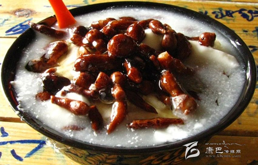 人參果飯也叫“卓瑪折絲”。將人參果煮熟后,放在米飯上面,細(xì)細(xì)地撒些白糖,再均勻地淋上一勺滾燙的酥油汁,一份營(yíng)養(yǎng)又好吃的人參果飯就做好了。人參果飯被藏族同胞視為一種吉祥的食物,只在婚禮、節(jié)日食之,以之待客,視為尊貴之意。在隆重的藏歷新年,人參果飯會(huì)被盛在一個(gè)小巧精致的盛器內(nèi),供于佛龕前。