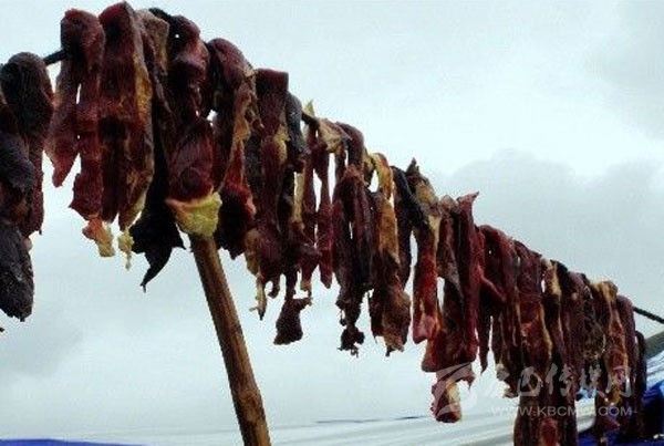 藏族同胞喜歡吃風(fēng)干的牛羊肉。風(fēng)干肉一般在冬天的十一月底制作。這時候的氣溫都比較低,在零度以下,把牛、羊肉割下來,掛在陰涼的地方,讓其風(fēng)干,去出水份。藏民把牛、羊肉割成小塊串上,或用竹籠掛在帳房、屋檐下的陰涼處,第二年的三月之后,將早已風(fēng)干的肉取來烤食或者直接生食,咀嚼時無渣塞牙。在高寒地區(qū),食品不易霉?fàn)€變質(zhì),去水又保鮮,故時至今日,吃風(fēng)干牛肉之風(fēng)仍盛行。