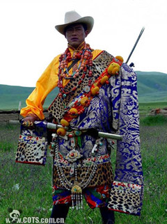 吐蕃時(shí)期   藏族服飾文化有了較大的發(fā)展。"中二丁王"時(shí)(相當(dāng)于中原西漢中期),南方雅隆河谷的吐蕃開始了冶煉鐵、銅、銀等礦產(chǎn),為金屬飾品的出現(xiàn)創(chuàng)造了條件。藏史記載,公元三世紀(jì)的拉妥妥日年贊時(shí),吐蕃贊普的服飾巳與眾不同,出現(xiàn)了服飾等級(jí)的差異。史載松贊干布時(shí)期,吐蕃的歷史翻開了新的一頁(yè),吐蕃文化得到迅速的發(fā)展,其服飾文化日漸發(fā)達(dá)。吐蕃奴隸制王朝等級(jí)森嚴(yán),在服飾上的表現(xiàn)也日臻完備。從反映吐蕃盛時(shí)的敦煌壁畫可看出,君臣服飾的等級(jí)差異,藏王一般只有贊普才能使用的三瓣寶冠箍住的有凹槽裝飾的無沿帽,呈紅色,通常高于一般人的帽子;藏王的侍從或臣下往往戴平頂無沿帽。衣袍的式樣也各有不同,官吏的章飾規(guī)定有一等瑟瑟,二等金,三等金包銀,四等銀,五等銅,六等鐵等大小兩類,共十二級(jí),裝在方圓三寸的盒子里掛在胸前,以區(qū)別職位的高低。武將的頭盔有形如塔的裝飾,戰(zhàn)士頭盔上有三只彩旗以表示出生的年月,隨著"惟以淬礪為業(yè)"的吐蕃冶煉業(yè)的發(fā)展,軍隊(duì)的鎧胄日趨精良,有的周身僅露兩個(gè)眼窩,勁弓利刃常不能破,其威嚴(yán)、勇猛之氣在今天大昭寺壁畫的吐蕃武士像中尚歷歷在目。吐蕃貴族不僅本人穿著華貴,還在聚會(huì)宴客時(shí),把傭人裝飾起來。而作為贊普的松贊干布則用一種紅帶子包頭,身著長(zhǎng)袍,足穿腳尖朝上的靴子,據(jù)《紅史》載,這種王服是受波斯王朝的影響,反映了文化交往已影響到了服飾文化層次,而從松贊干布伊始的吐蕃與中原的密切交往,兩種民族文化的長(zhǎng)期接觸更為藏族服飾的發(fā)展注入了新鮮血液。史載文成公主進(jìn)藏時(shí),帶入諸種花緞、錦、綾羅與諸色衣料二萬匹,還有大量的金玉器具。松贊干布及吐蕃大臣紛紛自行去掉氈裘,改穿絹綺。近代西藏的高級(jí)官吏,頭發(fā)綰成一髻,戴金翅白紗帽,這是唐代進(jìn)士的服飾。此外,還采納文成公主建議,令國(guó)人禁止"赭面"(用油涂面),文成公主進(jìn)藏還帶來了種植蠶桑和紡織技術(shù),"植??椊z兮"大大的促進(jìn)了吐蕃服飾技藝的發(fā)展,青海海西州都蘭出土的大批吐蕃服飾文物,真實(shí)、生動(dòng)地反映了吐蕃服飾的工藝水平。服裝的織物紋樣多為聯(lián)珠動(dòng)物紋,裝飾品的金質(zhì)首飾、佩飾的精美使人嘆為觀止。今天藏族婦女飾品的鑲嵌形制,可以從這些文物中找到原型。斯坦因的《古代中亞文化遺跡》一書也曾提到:"在吐蕃發(fā)現(xiàn)的遺物中,有很多具有花紋的絲織物,花紋中有些是印的,有些是織的,花紋圖象的變化很多,這一點(diǎn)很可以表示吐蕃商業(yè)的地位,……大概是中國(guó)與西亞之間的貿(mào)易重點(diǎn)。"頻繁的交往促進(jìn)了吐蕃經(jīng)濟(jì)的發(fā)展,也促進(jìn)了服飾文化的發(fā)展。 吐蕃是一個(gè)軍事帝國(guó),在它的發(fā)展過程中征服融合了青藏高原及其邊緣地區(qū)的許多其他民族,這是造成今天各地區(qū)藏族之間文化差異的重要原因。在服飾的表現(xiàn)上也是如此。吐蕃時(shí)代這種差異主要表現(xiàn)為東女、附國(guó)、黨項(xiàng)等部落服飾的不同,東女部落住在康延川(今昌都),處于母系氏族社會(huì)發(fā)展階段,其女王穿青毛綾(氆氌)裙,上披青袍,袖長(zhǎng)到地,冬穿用文錦裝飾的羔裘。發(fā)作鬟髻狀,兩耳垂珰(耳環(huán))。足穿革素(皮靴)。一般男子披發(fā),婦女辨發(fā),男女都用彩色涂面。王死居喪三年,不易服,不梳洗。附國(guó)是以今四川甘孜為中心,包括今四川阿壩一帶的嘉絨藏人的藏羌融合體。他們頭戴圓形皮帽,或帶幕離佳(即面罩一類飾物,為婦女所帶)。身披毛曷毛(氆氌一類)、皮裘,穿牛皮鞋。頸系鐵索,手貫鐵釧。王與酋長(zhǎng)以金為首飾,胸前掛著三寸長(zhǎng)的金花。黨項(xiàng)則是純游牧部落,"服氈襲褐,披氈以為上飾",早在北周時(shí)巳能制造精美的犀甲、鐵鎧。四川西北部還有屬黨項(xiàng)部落聯(lián)盟的鄧至、武興國(guó)和宕昌等,服飾習(xí)俗為頭藏烏皂突騎帽,身穿長(zhǎng)袍,下著小口褲、足穿皮靴,與今四川牧區(qū)藏族服飾相似。此外青海地區(qū)有吐谷渾,貴婦人披錦袍,戴金花冠。如女發(fā)型為辨發(fā)披于后,后飾珠貝,以繁多為高貴,這一服飾與今青海藏族婦女大致相同。這些地區(qū)服飾特征是今天各地不同藏族服飾的母型。 吐蕃王朝崩潰后,從九世紀(jì)中期到第十一世紀(jì)的二百余年間,西藏社會(huì)一直處于分裂割據(jù)的混亂狀況。這一時(shí)期戰(zhàn)亂不堪,服飾藝術(shù)的發(fā)展也難免厄運(yùn),停滯不前,而與戰(zhàn)爭(zhēng)有關(guān)的武士服飾卻濟(jì)時(shí)發(fā)展。在西藏阿里古格王國(guó)的遺址中,發(fā)掘有大量古代武士的盔甲和武器。其鎧甲多為鋼片甲,是用細(xì)皮條串結(jié)鋼片而成,串結(jié)方法頗為復(fù)雜,武器中的盾牌,系用藤條編織為圓形,直徑八十厘米,正面鑲有銅質(zhì)加固件,銅件上雕刻有細(xì)密的紋飾,故亦可謂是銅飾件,背面有四個(gè)銅環(huán),環(huán)間可用皮條相連,作握柄之用,無論這些服飾和兵器,是西藏本地生產(chǎn),還是外來流入,都說明其時(shí)西藏的武士服飾已具鮮明的本土特征與個(gè)性。 佛教僧侶服飾
