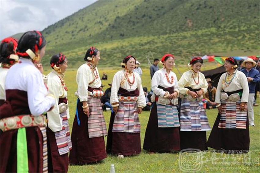 主要分布在道孚、雅江、康定縣折多山以西農(nóng)區(qū),九龍縣農(nóng)區(qū),瀘定嵐安鄉(xiāng)一帶又各自有特點(diǎn)。木雅地區(qū)服飾,婦女頂戴袋狀帽,將帽檐一側(cè)內(nèi)疊扣于頭上,上沿額伸出頭額前,寬至兩鬢,長(zhǎng)約30厘米的袋狀帽箭垂于腦后,然后用大紅頭繩或五彩頭繩編發(fā)辮纏盤于帽上,端莊嫵媚。男著柔軟的潔凈光面羊皮袍,或在皮袍面上鑲吉祥符,卷草花圖案,質(zhì)樸、粗礦而美觀,頭戴狐皮帽。